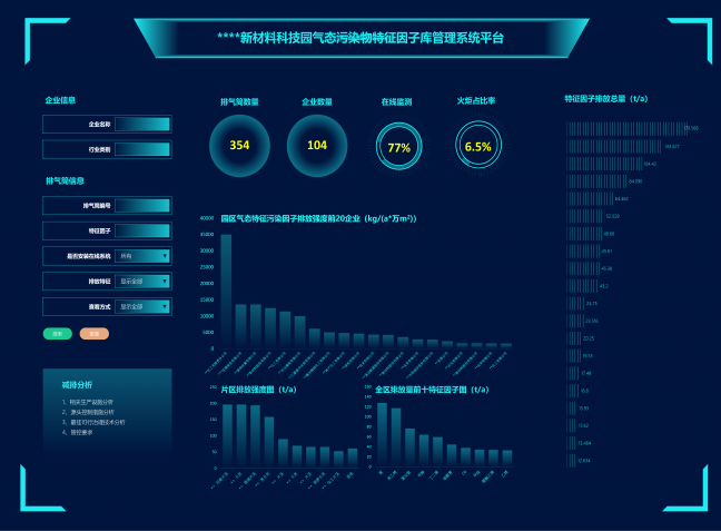 为摸清某化工园企业排放的废气种类、来源、分布等污染情况,对园区内100多家化工企业共300多个有组织排气筒的排放情况进行系统化摸排分析及采样监测,真实地反映废气排放的来源装置、工艺、排放环节、处理设施等关键信息,明确各企业有组织废气污染物的排放特征,准确、全面地为每个排气筒排放物质清单和特征因子建档。通过建立因子库大数据平台,实现了排放清单一张表、排放总量一本账、排放分布一张图,有效指导大气网格点监控系统建设、强化大气监控力度、提高环境监管水平。